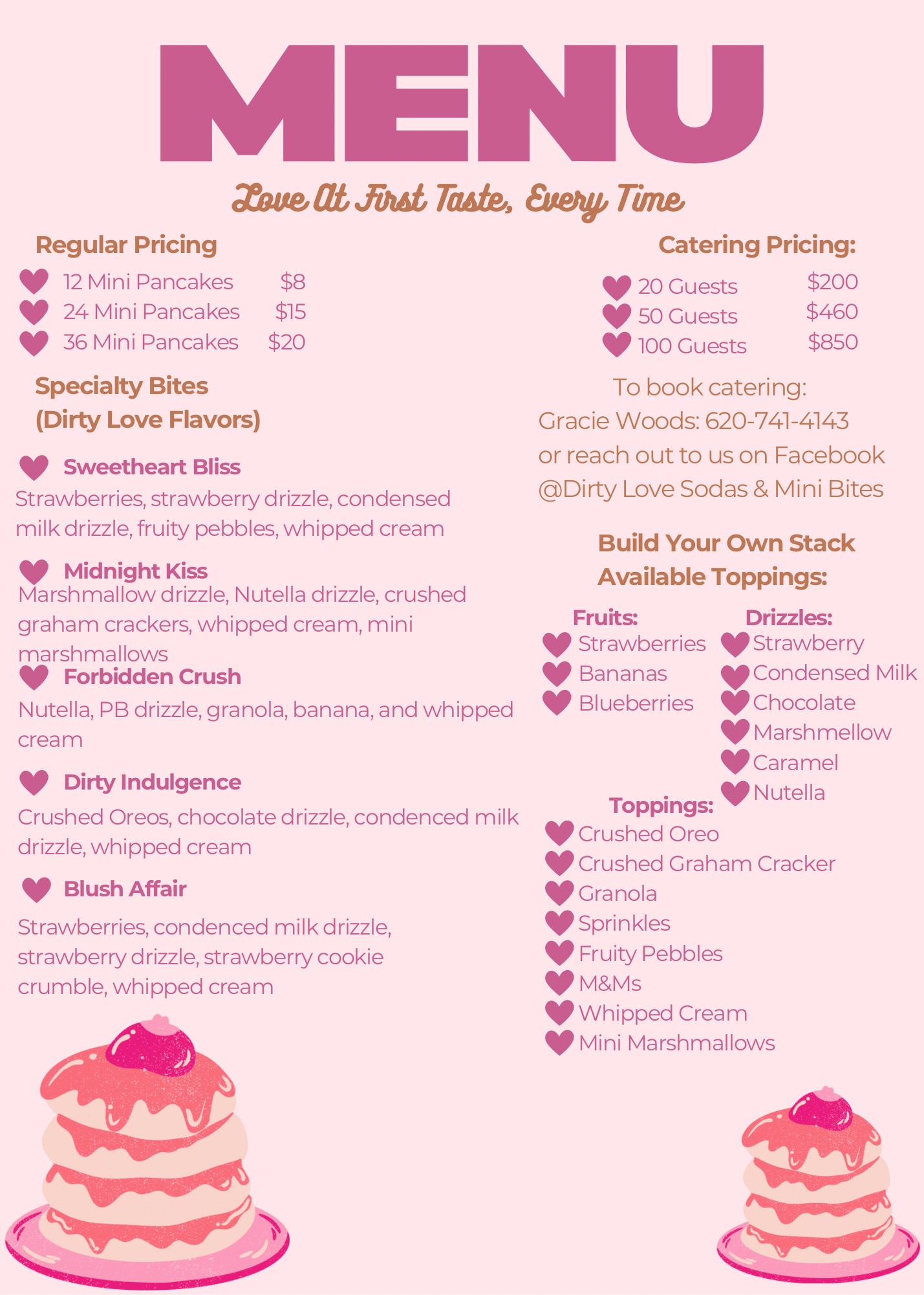 Whether you’re planning a wedding, birthday, corporate event, or a vendor pop-up, Dirty Love Sodas & Mini Bites brings the magic. We specialize in crafting refreshing dirty sodas and made-to-order mini pancakes that are sure to delight guests of all ages.